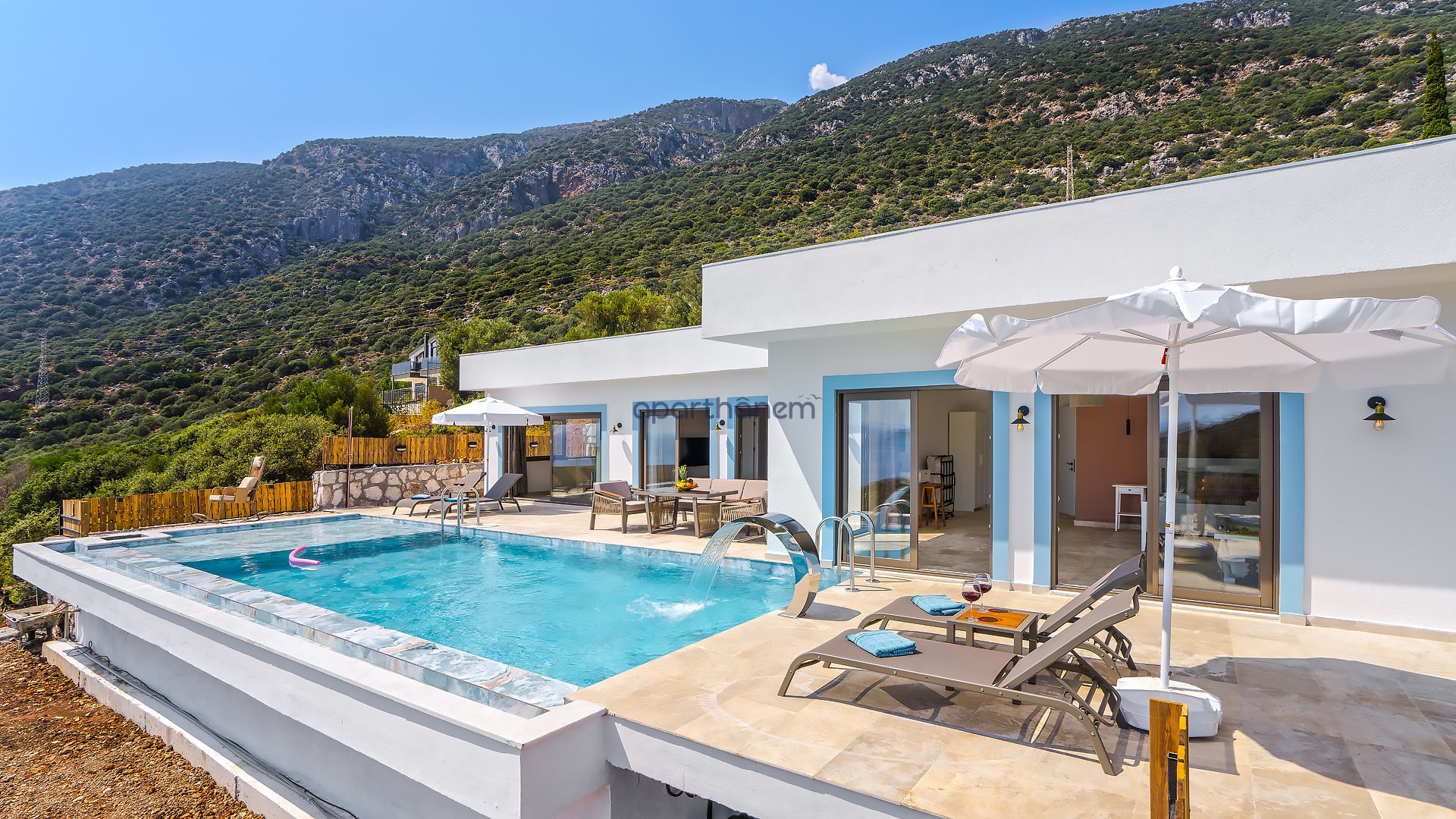 Salon : Salon içerisinde modern oturma grubu, uydu alıcısı, LCD TV, internet için modem, klima ve havuz terasına çıkış bulunmaktadır.
